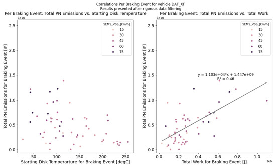 In contrast, after data filtering, a clear correlation was observed between the total PN emissions and total work of the braking event, providing evidence of an existing relationship between the two variables, as expected from physical principles. However, still no correlation was found between the total PN emissions of the braking event and the starting disc temperature, suggesting that any relationship between these two variables, if present, was less straightforward. In the literature (see [19], p. 73), so-called transition temperatures were observed for heavy-duty disc brakes. After such a temperature threshold was crossed, a sharp increase was observed in the particle number concentration. Below the transition temperatures, the particle number concentrations were near constant. A possible explanation for not finding a relationship between the temperature and PN emissions in our on-road tests was that under real-world on-road conditions, the transition temperatures of the brake discs were never reached.