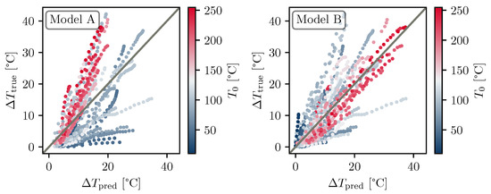 Figure 6 (left) shows the true (measured) disc temperatures versus the predicted disc temperatures from model A. The colour of each data point represents the initial temperature of the braking event. This figure clearly shows many individual braking events, distinguishable by their identical initial temperature . The results from model A indicate that there was a clear correlation between the temperature of the disc and the braking work . Furthermore, one can observe a noticeable pattern in the initial temperature distribution of the data points. Data points for which the model underestimates the disc temperature (data points below the grey line) tended to have small initial temperatures. On the other hand, data points for which the model overestimates the disc temperature (data points above the grey line) tended to have high initial temperatures. Based on this observation, a model was introduced that also takes the initial temperature of the disc into account. This model is referred to as model B and is defined as