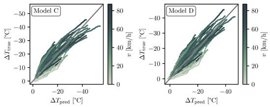 True (measured) disc temperatures versus the model-predicted disc temperatures for the temperature cooling events from model C (left) and model D (right). The colour of the data points represents the velocity v of the vehicle. Note that the x- and y-axes are inverted, i.e., they show decreasing temperatures from left to right and bottom to top, respectively.