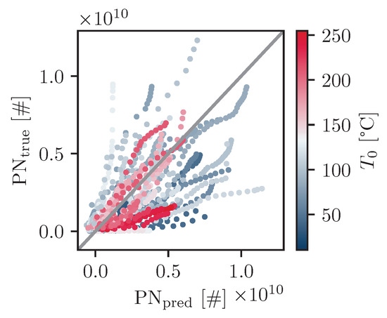 True (measured) particle numbers PNtrue versus the model predicted particle numbers PNpred. The colour of the data points represents the initial temperature of the braking event.