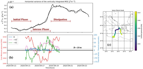 Hart parameters and MSLP in (b), increase in the horizontal variance of moist static energy, , together with the different phases of Ianos life-cycle in (a), and storm track over the chosen area to compute in time in (c).