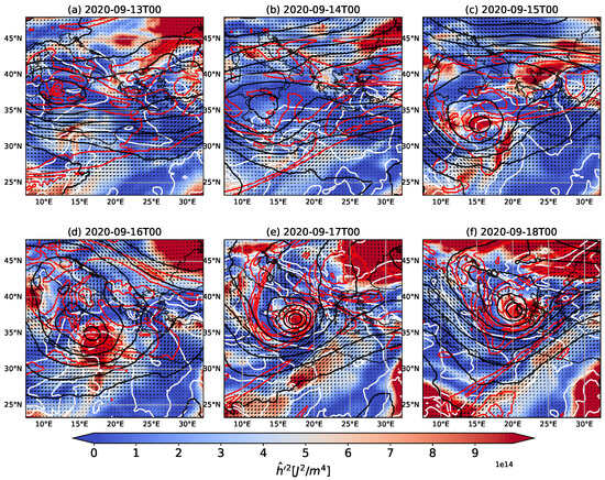 The increase in variance combined with the development of a cyclone has been observed for tropical cyclones, both in idealized simulation [] and in climate models [], specifically during the cyclone’s intensification []. The same happens for Ianos in the intense phase (Figure 1a), between the 16th and the 19th of September, when the thermal symmetry is between 10 m and 0 m and the upper-level thermal wind becomes positive and reaches high values (Figure 1b). Here we report a brief analysis of Ianos’ life cycle by looking at Figure 1 and the synoptic analysis shown by looking at Figure 2 and Figure 3. During cyclogenesis, before the 16th of September, the variance is low, and after the cyclone dissipates, after the 19th of September, the convection at the cyclone core is consumed, and the variance starts slowly decreasing. More specifically, from the 13th of September 2020 there is a convective cluster due to a weak cut-off low, east and south of Sicily, and a weak surface low is present over Libya (Figure 2a). On the 14th of September, the convective cluster to the south of Sicily and the surface low approach each other (black and white lines in Figure 2b). There is a small increase in variance around the surface low center and over sea near northern Africa in Figure 2b. This might be related to cold air, relative to the sea surface, that starts moving over very warm sea (1.5 °C warmer than average []). On the 15th of September, the two structures merge off the Libyan coast (Figure 3c). This is marked by the increase of (Figure 2c) near the cyclone core. On the 16th of September, the cyclone moves northward and deepens quickly, while the convection redevelops, enhancing the variance in the region once more (Figure 2d). On the 17th of September, the cyclone attains its mature phase (the central eye is starting to show in Figure 3e), as also indicated by the Hart parameters in Figure 1b, when a Potential Vorticity streamer is wrapped around the surface cyclone (red lines in Figure 2e), as also underlined in the literature []. It exhibits a tropical appearance and turns eastward. It is in this phase that the values reported in Figure 1b for the thermal asymmetry and the thermal wind make Ianos a tropical cyclone []. It has been thoughtfully underlined in the literature that, in this phase, the cyclone was maintained by a diabatic process, resulting from the release of latent heat in the condensation process inside clouds and by the wind-induced surface heat exchange feedback [].