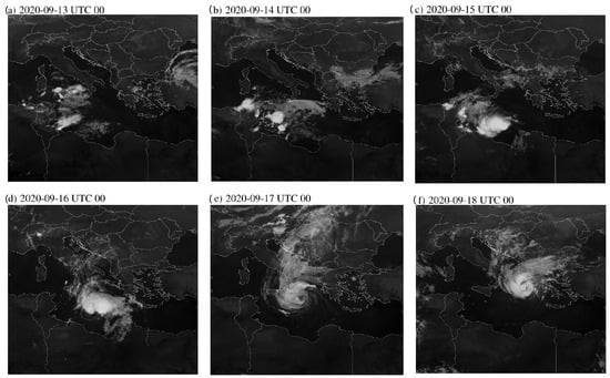 Synoptic analysis of the Ianos cyclone. Eumetview satellite images (High Rate SEVIRI IR10.8 m Image—Meteosat Second Generation, MSG) for different days during Ianos’ life cycle.