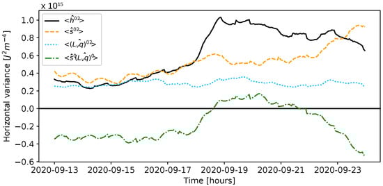 By examining these components separately, we aim to clarify their role during different phases of the cyclone. As illustrated in Figure 4, where the data for Ianos reveals the observed increase of and its decomposition, it becomes evident that the growth in variance cannot be explained by the increase in alone. The latter happens, as mentioned, in the case of tropical cyclones [,], given the condition of weak temperature gradient in the tropics, and thus in the absence of thermal energy variance. In the case of midlatitude cyclones, both dry static energy and latent heat energy, as well as their covariance, are necessary to explain the increase in . More specifically, by comparing the areal average shown in Figure 4 with the vertically integrated MSE variance terms over the chosen area (Figure 5, Figure 6, Figure 7 and Figure 8), one can gain insight into the physical processes happening in the cyclone’s evolution.