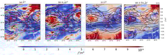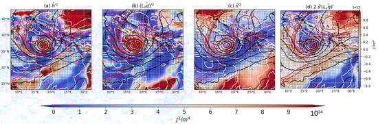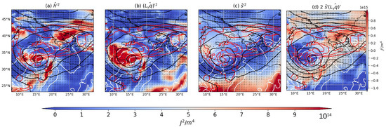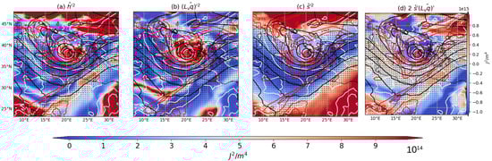 As mentioned, the cyclogenesis of Ianos was due to the merging of a convective cluster due to a weak cut-off low south-east of Sicily and a weak surface low over Libya, which happened between the 13 September 2020 and the early morning of the 15th of September. Both and are positive, and their covariance term is negative (Figure 4). Figure 5, with positive values of and , and negative indicates the presence of strong convection surrounded by areas free of convection, as also seen in the satellite image in Figure 3a,b. The high value of (see Figure 5b) is due to the increase in humidity (convective cluster) and the high value of (Figure 5c), together with the negative (Figure 5d), indicate the presence of a cut-off low (black contours of geopotential height), which decreases temperature by bringing the cold air, and ignites convection. It is the increased humidity and decreased temperature in the cut-off region that generates a negative . This covariance term suggests upper-level cold air intrusion interacting with low-level moisture, promoting instability and enhancing convection. The presence of a cut-off low enhances dry static energy variance, supporting baroclinic forcing as a key contributor to early cyclogenesis. Cut-offs are common precursors for the development of medicanes []. They are cold-cored depressions that are produced by a westerly trough [,]. These systems are found in the upper troposphere (e.g., 500 hPa level) and are associated with cold air aloft. As the low approaches the Mediterranean environment with small baroclinicity (no surface low is present yet in Figure 5; see white lines), the temperature above decreases, increasing convective instability and lifting air masses []. Surface depressions may develop below these systems whilst cold air aloft promotes deep convection and cloud development, resulting in persistent heavy rainfall [].