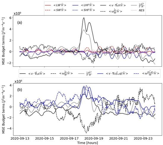 Budget terms as in Equation (7). In (a), the moist static energy terms, and in (b), the dry static energy and the humidity advection in the vertical and the horizontal. In Pink is the residual term of the budget.