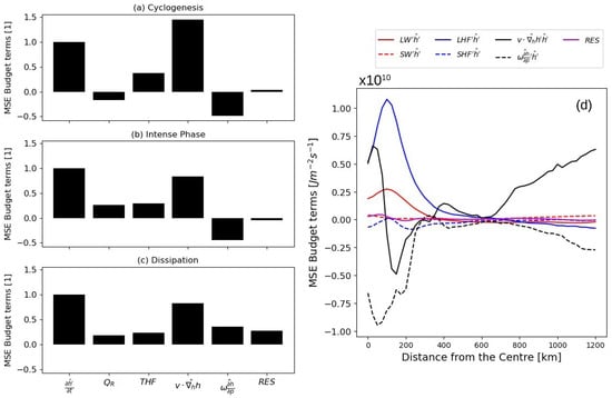 The relative contribution of the normalized terms of the moist static energy variance budget. In (a), the terms for the initial phase are averaged over the chosen area, from the 15th of September at 00 UTC to the 16th of September at 23 UTC. In (b), the terms for the intense phase from the 17th of September at 00 UTC to the 19th of September at 00 UTC, and in (c), the terms for the dissipation, after the 19th of September. In (d), a special focus on the intense phase where the radial mean of each term, from the cyclone center to 1200 km, is reported.