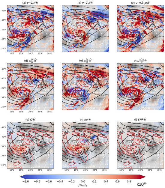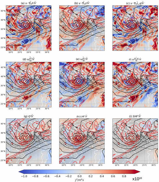 Budget terms as in Equation (7) for the 15 September 2020 at 00 UTC. In shading, (a–c) show the horizontal advection term of moist static energy, dry static energy, and latent heat energy, respectively; (d–f) show the vertical advection term of moist static energy, dry static energy, and latent heat energy, respectively; (g) shows the radiative cooling term; (h) is the latent heat flux term; and (i) is the sensible heat flux term. Black lines represent 500 hPa geopotential height (from 5000 to 6000 m), red lines represent potential vorticity at 300 hPa (from 0 to 8 PVU), white lines represent MSLP (from 990 to 1010 hPa), and vectors represent 300 hPa wind in m/s.