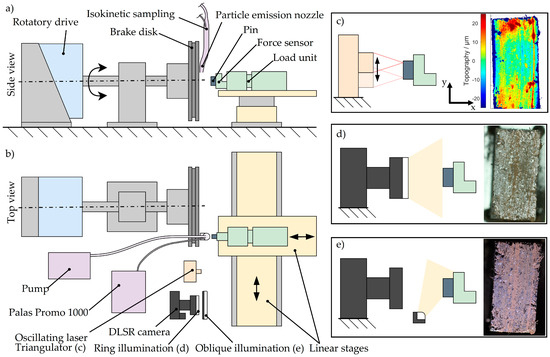 Figure 1 shows a schematic representation of the Automated Universal Tribotester (AUT, [47]), including the disk drive, pin translation unit, integrated at-line optical measurements system for the pin and the particle emission measurement. The disk drive (Figure 1a, left side) offers rotational speeds from 0 to 1500 RPM. The pin translation unit (Figure 1a, right side) enables both radial and axial displacement of a pin. For brake simulation, static and dynamic loads of up to 400 N based on a linear guide equipped with an additional actuator can be achieved. This design supports a variety of testing protocols, from static procedures to complex load profiles such as those derived from WLTP or real-world driving signals. During operation, the forces acting on the pin are recorded by a 3D piezoelectric force transducer in conjunction with a strain gauge bridge, enabling the precise determination of friction coefficients. The temperature of the pin is measured by a thermocouple embedded 2 mm below the pin surface, and the disk temperature is measured by an infrared thermometer close to disk edge.