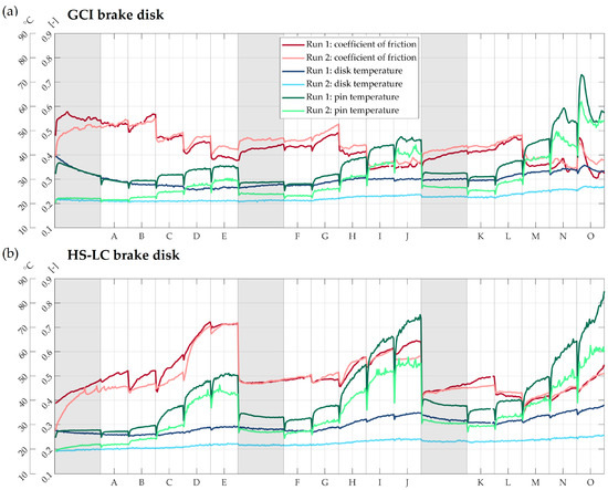 The results from the tribometer are shown in Figure 2 for the GCI and the HS-LC disks in terms of coefficient of friction (COF) and the disk and pin temperatures. In Figure 2a, the COF of the GCI brake disk steadily increases in the first two blocks of each segment (A–B, F–G and K–L), followed by a significant decrease. In the subsequent braking block, the COF either increases or maintains its level before dropping with the onset of the next block (C–E, H–J and M). The high-energy blocks (N–O) exhibit a distinct behavior, with the COF increasing in the first brake applications before significantly decreasing. The disk temperature remained at a low level, and the pin temperature had a strong correlation with the friction work.