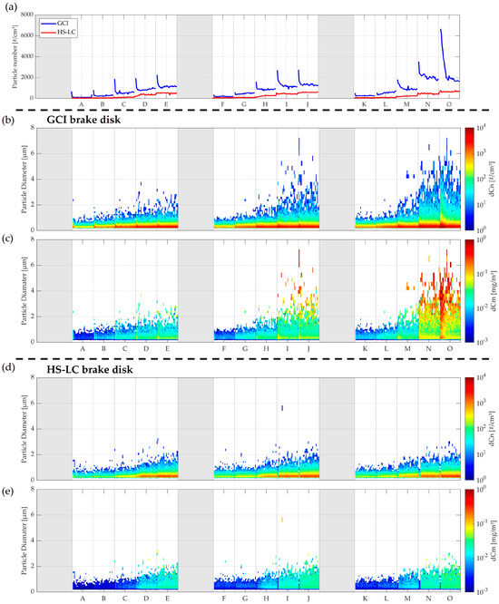 Particle emission in the form of (a) PN for both disks, (b) number-based particle size distribution for the GCI brake disk, (c) volume-based particle size distribution for the GCI brake disk, (d) number-based particle size distribution for the HS-LC brake disk, and (e) volume-based particle size distribution for the HS-LC brake disk.
