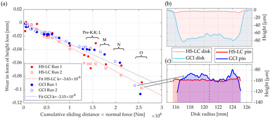 Figure 4a shows the wear, quantified by the height loss of the pin, over the product of the cumulative sliding distance and the applied normal force. The pin used with the GCI disk shows a relatively linear behavior up to Nm; the height then decreases more quickly. The last data point in both runs shows a disproportionate wear with a significantly higher height loss, hinting at the presence of severe wear. Both runs of the GCI brake disk show a good reproducibility, unlike the HS-LC disk, where a larger spread is seen. From the slope k of a linear fit, the wear rate can be derived by multiplying with the pin surface area. The wear rates of the pin are comparable, suggesting that the coated disk’s wear rate is relatively small, consistent with the reduced particle emission observed in Figure 3e. The disk and pin topographic profiles are shown in Figure 4b and Figure 4c, respectively. The former was measured only once and after some additional tests, thus it does not correspond to the displayed pin profiles. The slight wear of the HS-LC disk and homogeneous pin wear are visible. In contrast, the GCI brake disk shows a significant, spatially non-uniform material loss with a height difference of up to 20 µm, which is also visible in the pin profile.