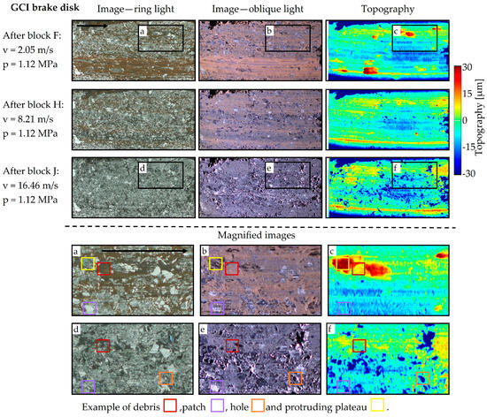 Image sequence of the pin used with the GCI brake disk from segment 2 in run 2. Images with oblique and ring illumination are displayed in the original color. The arrow represents the sliding direction, and its length represents a scale of 5 mm. Magnified images (a–f) show examples of the main features.