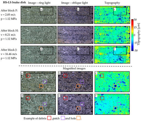 Image sequence of the pin used with the HS-LC brake disk from segment 2 in run 2. Images with oblique and ring illumination are displayed in original color. The arrow represents sliding direction, and its length represents a scale of 5 mm. Magnified images (a–f) show examples of main features.