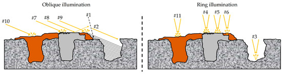 Differences in oblique and ring light illumination on a pin surface. Debris is represented by the brown color, while the primary patch is light gray, and the matrix is the textured gray region. Numbers represents different light rays as addressed in the text.