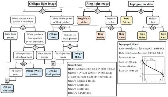 Figure 8 shows the segmentation scheme for an individual sample starting with a six-dimensional matrix (R, G, B, L*, a*, b*) for each illumination type, as well as the 2D matrix containing the topographic data. The segmentation criteria are coded as “R”, “O”, or “T”, depending on the origin of the data used, and a genealogical numbering system. This former part is important as some criteria from the ring light images are used in the segmentation of the oblique light images, and vice versa. Following the segmentation process, binary masks for each of the resulting classes are stored. The total pin surface of each data source is divided completely in the segmented classes. Note that, from the six available colors, only L* and b* were used, as they showed the largest contrast with the given surface coloring. The thresholds are normalized to represent the dynamic range of each color between 0 and 1. The topography data are segmented using the material ratio curve according to the DIN EN ISO 13565-2:1998-04 [55]. To establish global thresholds for the patches (Spk) and holes (Svk), all measurements (36 topographic recordings for GCI and HS-LC, respectively) were considered in the same material ratio curve. Lastly, the highest value for Spk and lowest value for Svk were chosen from both disks. An individual threshold for each topographical measurement (i.e., single block) might lead to a non-comparable outcome. For instance, a dataset with shallow holes and low patches might lead to soft thresholds (overestimation), while a dataset with deep holes and high patches might lead to harsh thresholds (underestimation). An overview of the segmented classes is displayed in Table 2.