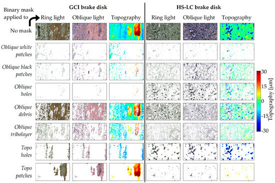 In this study, the availability of both the color imaging and the topographical data does not support a unique assignment of a class to the contact area, as shown in Table 2. To propose the protruding patches from the class topo patch as contact area, a flat counterpart is required. In reality, the disk wears off heterogeneously, as seen in Figure 4b. Bettge and Starcevic proposed a method for subtracting the grooves from the pin surface to enhance the patch detection [33]. The best approach would be to incorporate the disk’s topography measurement into the at-line acquisition system.