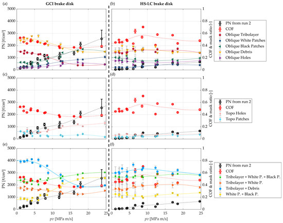 Averaged coverage ratios over pv from both runs for (a,b) image classes, (c,d) topographic classes, and (e,f) combination of image classes for the GCI and the HS-LC brake disks, respectively. Displayed trend lines were generated using a smoothing spline with a smoothing factor of 0.07. Error bars show standard deviation from both runs.