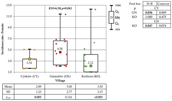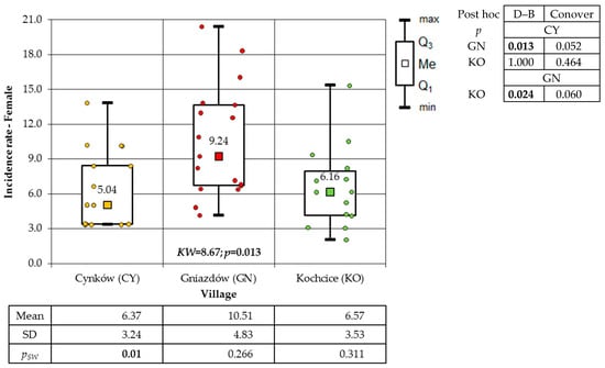 Incidence rates of female cancer in the study villages (result of Kruskal–Wallis test and post hoc tests: Dunn–Bonferroni and Conover).