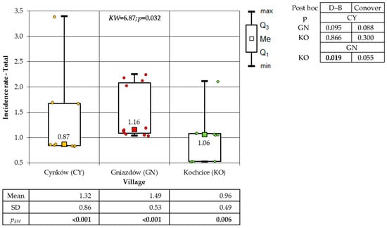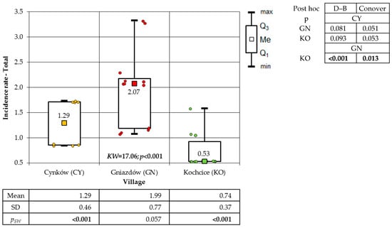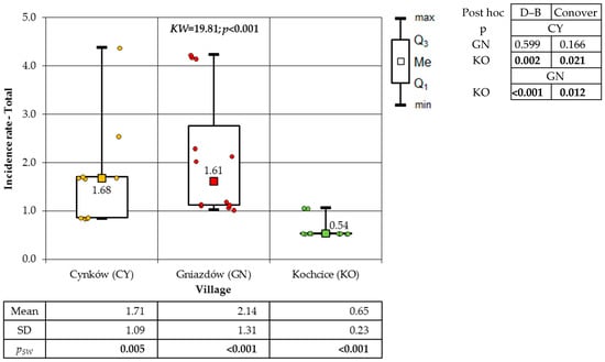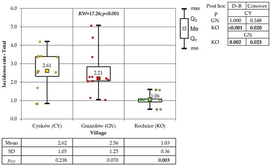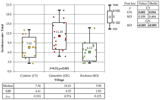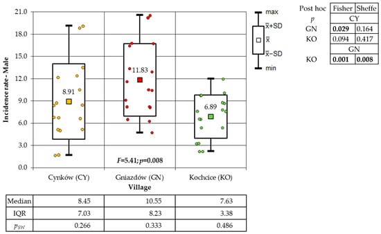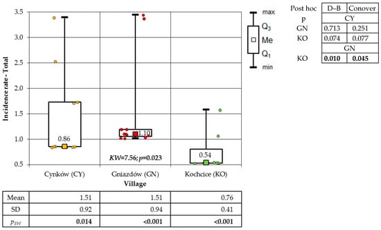 As part of the statistical analysis of the study’s results, a comparison was made in the first stage of the incidence rates of malignant tumours between the three villages analysed and between the two municipalities. Initially, the normality of the distribution of incidence rates was verified, and following positive verification, parametric tests were applied: one-way ANOVA—comparison of socio-communities; two sample one-tailed t-test—comparison of communes. The implementation of non-parametric tests was necessitated by the initial negative verification of normality. The subsequent analysis will utilise both the Kruskal–Wallis test and the Mann–Whitney test. In instances where substantial discrepancies in the incidence rate were identified between the analysed hamlets, appropriate post hoc tests (Dunn–Bonferroni and Conover) were employed.