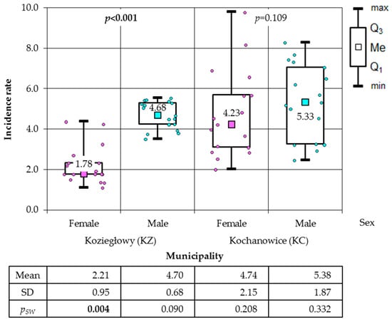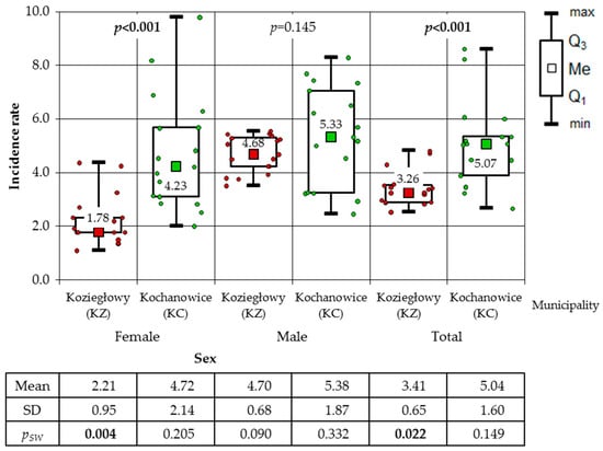 Incidence rates of cancer among women and men in the municipalities of Koziegłowy (KZ) and Kochanowice (KC) (results of Mann–Whitney test).