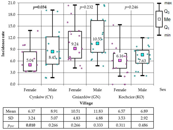 The Central Statistical Office (CSO) of Poland and the Local Statistical Offices in the investigated communes and villages obtained data on the number of inhabitants of the respective villages and communes for the years 2005–2022, taking gender into account. The incidence rate (IR) was calculated for the population of the villages (CY, GN, KO) and communes (KZ, KC) in the years 2006–2022, by gender, based on the acquired data. The formula used was as follows: