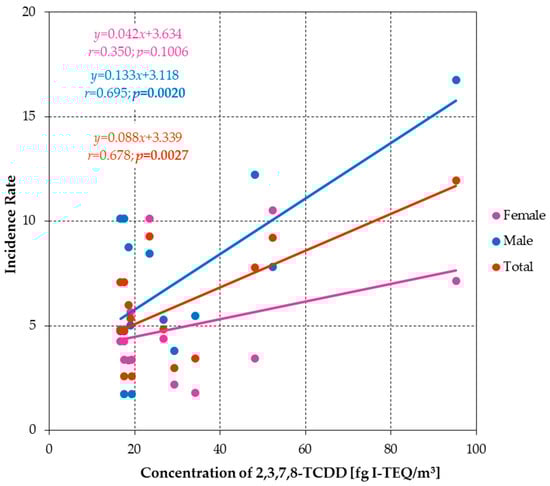 The analysis demonstrated that the cancer incidence rate (IR) is contingent on the long-term concentration of the congener 2,3,7,8-tetrachlorodibenzo-p-dioxin (2,3,7,8-TCDD) in the atmosphere of each locality (Figure 13). This finding serves to substantiate the impact of the carcinogenic compound in question on the incidence of cancer within the population under study.