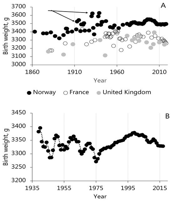 However, a century of studies in human reproduction have only sporadically emphasized the importance of environmental factors on human reproduction. Most studies on BW have stressed that low BW is linked to adverse socioeconomic conditions [30,31], which affects mothers and unborn children. BW increments are viewed as slow but progressive as they increase due to gradual socioeconomic development over multiple decades [32]. Gradual socioeconomic development contributes to maternal height and weight increments, which compound socioeconomic effects, leading to higher BW [30,32,33]. Concurrent fertility rate declines diminish infectious diseases’ impact [34], which stabilizes the temporal variation in BWs. The underlying mechanisms are primarily linked to the maternal phenotype, namely, height, weight [33], nuptial status, parity, and maternal age [35]; but nutritional status, such as macronutrient intake (calories, protein, fat, carbohydrates [36]) and micronutrient supplements (iron, folic acid, etc. [37]), can also be important. The temporal variation in nutrition and infectious diseases can lead to considerable year-by-year variation in BW, and the direct dependency on nutritional conditions underlines that BWs also in the 21st century remain vulnerable to economic and social disruption [38,39,40,41,42].