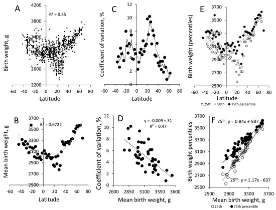 Birth weight (BW) and birth weight variation for 770 observations: (A) birth weight (g) vs. latitude; (B) mean BW for even-integer latitudes; (C) coefficient of variation (×100) aggregated for even-integer latitudes; (D) the relationship between the coefficient of variation and birth weight for even-integer latitude records; (E) 25th, 50th, and 75th percentiles for even-integer latitudes, with R2 for a second-order function for the 50th percentile; (F) scatterplot of 25th and 75th percentiles vs. mean birth weight.