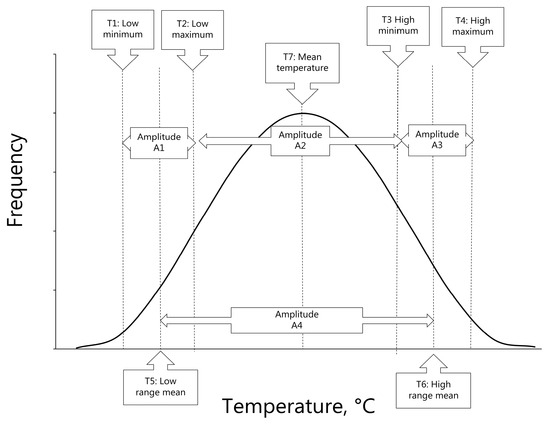 These included the following: T1—the lowest daily minimum temperature in any month; T2—the corresponding daily maximum monthly temperature with the lowest minimum temperature; T4—the highest daily maximum temperature in any month; and T3—the corresponding daily minimum monthly temperature in the month with the highest maximum temperature. The mean annual temperature (T7) was defined as the mean of the four temperatures, i.e., T1 to T4 (Table 2, Figure 3). Seasonal lows were defined as the mean of T1 and T2 (T5), and seasonal highs were defined as the mean of T3 and T4 (T6), which was associated with the amplitude A4, given as the difference between T5 and T6.