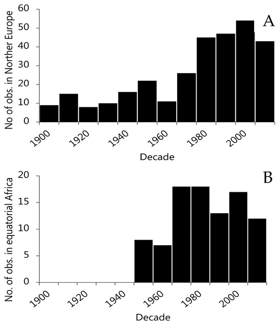 Overview of the temporal distribution of BW records in (A) Europe and (B) equatorial Africa by decade.