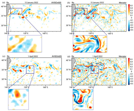 Surface Rossby number (Ro = ξ/f; shading) in the Kuroshio Extension region on 15 January 2022 (a,b) and 1 April 2022 (c,d). Ro in the AVISO dataset is shown in (a,c) while (b,d) represent the Ro in GLORYS12 reanalysis.