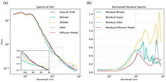 Power spectra of different models on the GLORYS12 validation set. (a) Power spectra of KESHDiff (red), U-Net (light blue), SR-GAN (yellow), bilinear interpolation (green), and the GLORYS12 high-resolution data (blue) via a 2DFFT. (b) The error ratios of spectra between different models and GLORYS12 high resolution.