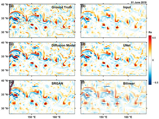 Surface Rossby number in the study area on 1 June 2019, with (a) GLORYS12 (serving as ground truth here), (b) input field, (c) diffusion Model, (d) U-Net, (e) SR-GAN, and (f) bilinear interpolation results.