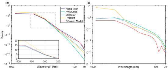 (a) Power spectra of 1/16° resolution KESHDiff (red), 1/16° resolution HYCOM (yellow), 1/16° resolution GLORYS12 (light blue), 0.25° resolution AVISO input (green), and multi-satellite along-track observations (blue) via a 2DFFT. (b) The difference between the four gridded datasets and along-track observations in (a).