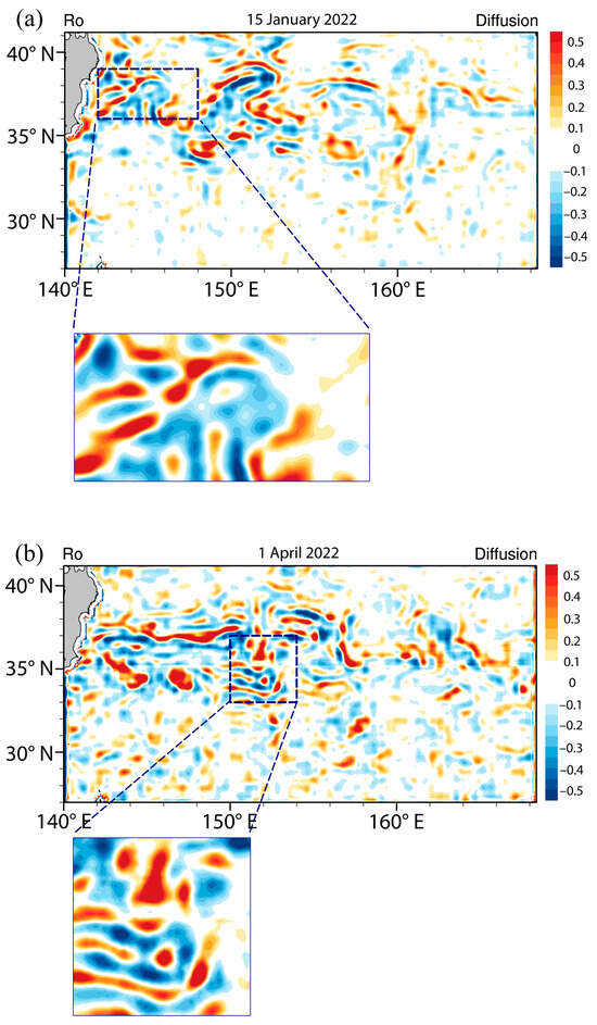 Same as Figure 1 but for KESHDiff outputs. Rossby number Ro on (a) 15 January 2022 and (b) 1 April 2022.