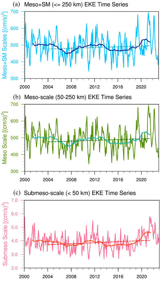 Monthly EKE at different scales from 2000 to 2022; (a) eddy-scale (light blue) and its 35-month running averaged component (blue curve); (b) mesoscale (250–50 km; green) and its 35-month running averaged (light blue) time series; and (c) submesoscale (<50 km; pink) and its 35-month running averaged (red) time series. The dashed lines in the figures represent the trends after 2004.
