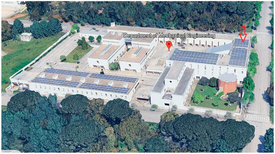 DEM-FCTUC, located at the Polo II engineering campus of the University of Coimbra, serves as demo site 6 for this study. Constructed in 1995, the building spans about 7000 m2 and houses classrooms, offices, meeting rooms, laboratories, administrative rooms, a library, and a cafeteria. The facility accommodates about 1000 students, 60 teachers, and 10 administrative and nontechnical workers. The red arrow indicates the building where the investitated took place as shown in (Figure 1).
