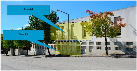 Three areas were selected for monitoring within the Mechanical Engineering Department’s didactic block (Figure 2, Figure 3, Figure 4 and Figure 5): Room 6.3, Room 3.3, and a corridor. Room 6.3 is a naturally ventilated classroom, with no fan, measuring 6m by 10 m and covering a total area of 60 m2. It features four east-facing windows with a total glazed area of 10 m2. The room is heated by warm-water radiators connected to a centralized natural gas boiler.