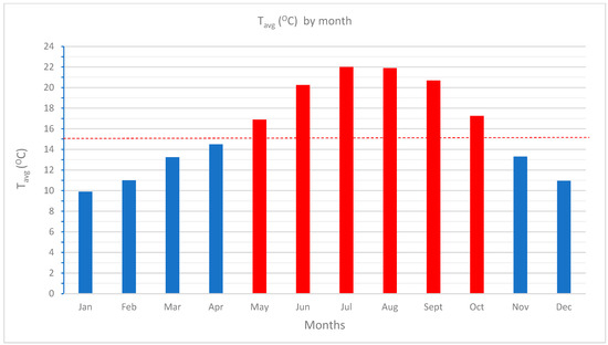 Coimbra’s historical climate is presented to define the heating or cooling seasons. Climatological data for Coimbra from 1981 to 2010 is used to determine the monthly temperature range over 30 years. The record high temperature, average maximum temperature, average minimum temperature, and record low temperature are presented for each month in Table 2 [36]. In Table 2, periods with rising temperatures (from 6 °C) are highlighted in orange, with higher temperatures being darker shades. While temperatures below 6 °C are highlighted in lighter colours from white to blue. Also, an average temperature value, Tavg, is derived from the mean of the average maximum and minimum temperatures for each month. Based on the Tavg values, each month is categorized as a heating or cooling season. Tavg values below 15 °C are classified as the heating season, while Tavg values above 15 °C are categorized as the cooling season. Tavg values against each month are presented in Table 3.