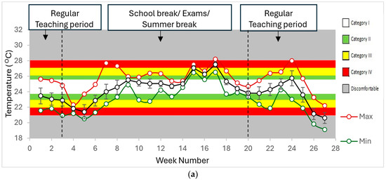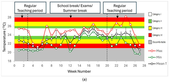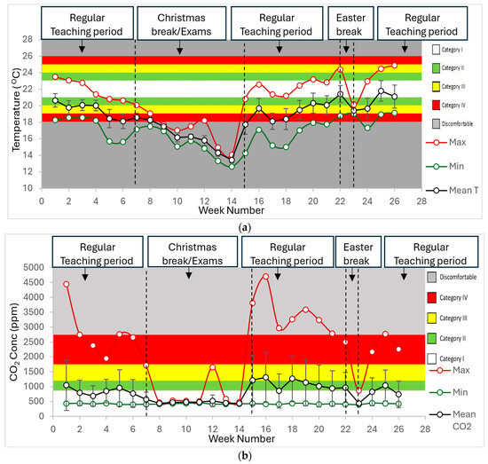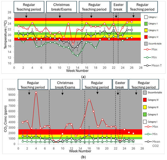 The result is based on the outcomes from monitoring equipment measurement system 5 (Meas. Sys. 5) and measurement system 7 (Meas. Sys. 7) in room 6.3 and room 3.3 alone to describe the IAQ and thermal conditions. The period “Classes” from Table 1 was defined as the period of occupancy, i.e., the period of regular teaching activities. In Figure 11, Figure 12, Figure 13 and Figure 14 below, each period is highlighted and labeled at the top of the chart area and separated by vertical broken lines. The class period is labeled “Regular teaching period”, and the unoccupied periods are labeled “Christmas break /Exams”, “Easter break”, or “School break/Exams/Summer break”. For the heating season, the following weeks fall within the regular teaching period: the 1st to 7th week, the 16th to 22nd week, and the 24th to 26th week. The cooling season weeks are the 1st to 3rd weeks and the 21st to 27th weeks. Each parameter is represented with points marking the mean weekly value (mean-Ta, mean-RH, and mean-CO2), the maximum weekly value (max-Ta, max-RH, and max-CO2), and the minimum weekly value (min-Ta, min-RH, and min-CO2). The mean weekly value is the average of all the recorded readings for a given parameter in a week. The maximum weekly value indicates the highest recorded reading for a parameter in the referenced one-week period. In contrast, the minimum weekly value is the lowest recorded reading for the same parameter in the same week. The red points indicate the maximum weekly values, the black points indicate the mean weekly values, and the green points indicate the minimum weekly values.