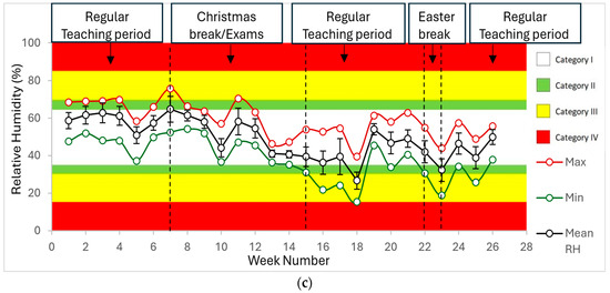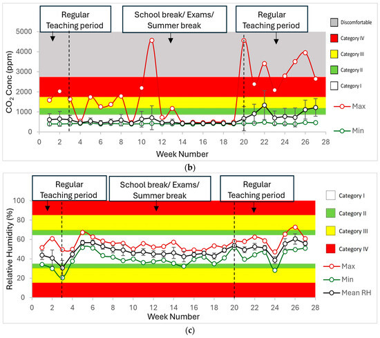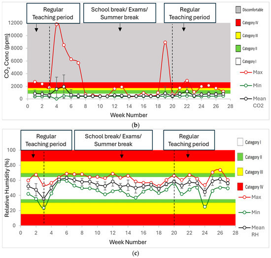 The results obtained in the naturally ventilated room 6.3 (Meas. Sys. 5) during the heating season (1st of November 2022 until 30th of April 2023), between 9 a.m. and 8 p.m. (9:00–20:00) are presented in Figure 11, by three parameters: air temperature (Ta), carbon dioxide concentration (CO2), and relative humidity (RH). Ta parameter is presented in Figure 11a, CO2 in Figure 11b, and RH in Figure 11c. During this period for room 6.3, the maximum air temperature was recorded in week 26 (late afternoon with Ta at about 24.7 °C; this week is within the regular teaching activity period with classroom occupation. This air temperature reading was recorded between 17:00 and 18:00 on the 16th of April 2023). The lowest air temperature recorded was in week 14, during the school exam period outside the regular teaching activity, while the lowest classroom temperature during occupancy was in week 18, with Ta at 15.5 °C on the 3rd of March 2023. We observed the highest recorded CO2 concentration in the classroom in week 4 during the regular teaching period, 9432 ppm. The highest CO2 conc was 3614 ppm outside the regular teaching period in week 12.