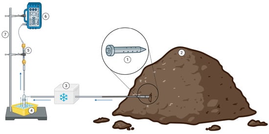 Schematic of the compost sampling setup used for simultaneous collection of air- and water-soluble analytes. (1) Stainless steel soil probe inserted into the (2) compost pile enables sampling of emitted volatiles. The air is pulled sequentially through (3) a cooler containing ice, (4) a 10 mL collection tube housed within a Teflon impinger submerged in an ice bath (for water-soluble compounds), and (5) a dual bed sorbent tube with Tenax-TA and Sulficarb (for water-insoluble compounds), while being drawn into the (6) Gilian™ air sampling pump. Components 1–6 are connected via Teflon tubing, with blue arrows indicating the direction of airflow. A support stand (7) secures the air pump and sorbent tube in place throughout the sampling process. Created in BioRender. McCown, K. (2025) https://BioRender.com/kf03yvd.