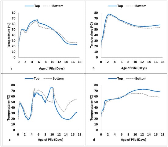 Average temperature profiles of the compost piles studied, from probes located on the top and bottom of piles. (a) Yard waste (YW), low-temperature compost; (b) YW, high-temperature compost; (c) mixed food/yard waste (FY), low-temperature compost; (d) FY, high temperature.