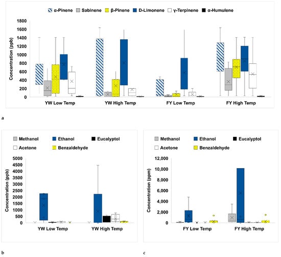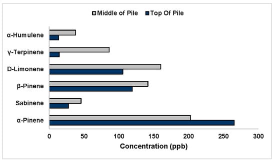 A comparison of the emissions from each pile type is shown in Figure 6. For overall terpene emissions, higher levels were seen in the YW pile with concentrations as high as 1600 ppb in comparison to 1250 ppb for FY piles (Figure 6a). Alcohols were seen to have a much higher emission with the FY piles, with concentrations reaching 10,000 ppm, while the YW pile reached 2100 ppb (Figure 6b,c).