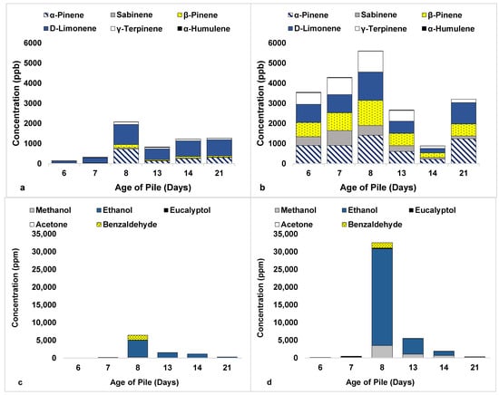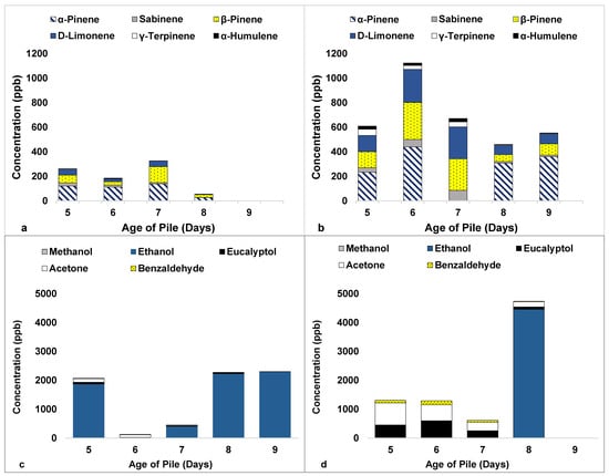 Terpene emissions over time from (a) yard waste (YW), low-temperature compost pile, and (b) YW, high-temperature compost pile, via TD-GC-MS analysis (water-insoluble). Alcohol and other VOC emissions over five consecutive days from (c) YW, low-temperature compost pile (d) YW, high-temperature compost pile, via HS-GC analysis (water soluble).