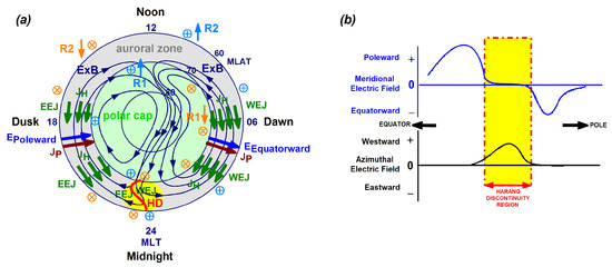 Harang Discontinuity [1] is a magnetosphere–ionosphere (M–I) conjugate phenomenon [2]. Its ionosphere component was first reported in 1946 by Harang [3], who observed a discontinuity in the magnetic field perturbation (ΔH) pattern. However, the importance of the discontinuity, as a region of reversal, transition, or change for most substorm- and polar-convection-related phenomena, was first emphasized much later, in 1972, by Heppner [1]. In the ionosphere, Harang Discontinuity occurs within the nighttime auroral zone, in a narrow longitude region, mostly in the premidnight and midnight magnetic local time (MLT) sectors [1,2], but sometimes in the postmidnight MLT sector [4], and occasionally, even deep in the evening MLT sector [5]. To illustrate the Harang region plasma environment in the ionosphere, Figure 1a shows the two-cell polar convection pattern. There, the F-region plasma is driven by the mapped-down magnetospheric electric (E) field. Ordered in a twin-cell vortex pattern [6], the plasma E×B drifts clockwise in the dusk cell and anticlockwise in the dawn cell. Plasma flows are antisunward across the polar cap (marked in light green) and sunward in the oval region (marked in gray). Ionospheric E-fields (marked in blue) are directed poleward on the duskside and equatorward on the dawnside. These E-fields are associated with ionospheric Pedersen currents (JP; marked in dark red), which connect the oppositely directed Region 1 (R1) and R2 field-aligned currents (FACs): downward (↓) R2 with upward (↑) R1 on the duskside and ↓R1 with ↑R2 on the dawnside. Meanwhile, ionospheric Hall currents (JH; marked in dark green) flow antisunward: both in the duskside eastward electrojet (EEJ) and in the dawnside westward electrojet (WEJ).