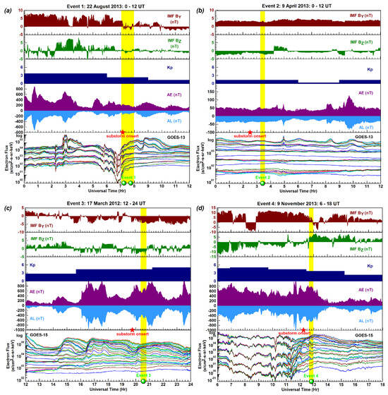 Returning to Figure 2d, Event 4 occurred under duskward IMF orientation (BY ≈ 5 nT) and at the end of a long-lasting southward IMF alignment (BZ < 0), when the IMF turned northward (max BZ ≈ 9 nT) during an intense substorm (AL ≈ −650 nT and AE ≈ 800 nT) that started at 12:17 UT (marked as star symbol in red) near magnetic midnight and also when the declining geomagnetic activity was still intense (Kp = 4-). As GOES-15 traveled in the postmidnight (3 MLT) sector, it observed only weak dispersionless particle injections in Event 4. However, GOES-15 observed the intense particle injections related to the previous substorm (AL ≈ −1000 nT) unfolding in the dawn (3 MLT) sector.