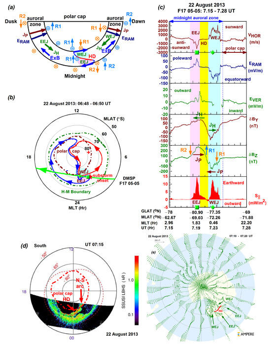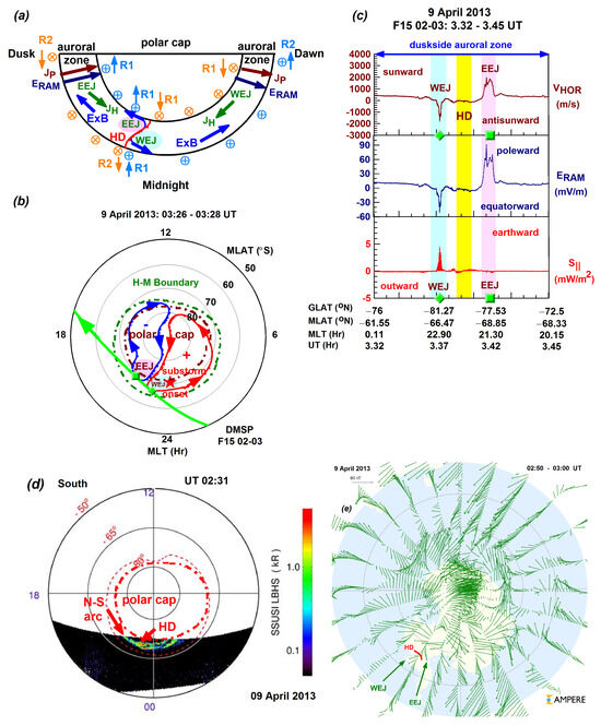 Figure 5 depicts the duskside scenario of Event 2 (9 April 2013) occurring in the Southern Hemisphere. As shown in Figure 5a by the schematic diagram, the dawn cell intruded duskward, and therefore, the dawnside WEJ appeared near the oval’s equatorward edge, where the plasma was flowing back toward midnight or antisunward. Meanwhile, the duskside EEJ was located near the oval’s poleward edge, where the plasma was flowing sunward. Thus, in the Harang region, the dominating duskside EEJ became a WEJ via an anticlockwise rotation. In Figure 5b, the polar convection plot depicts the above-described two-cell convection pattern and the F15 pass. As the F15 satellite crossed the oval in the postmidnight–dusk direction, it first observed the duskward-intruding dawn cell (associated with the WEJ), where the substorm onset occurred (marked as star symbol in red), then the dusk cell (associated with the EEJ), and the discontinuity itself located between the two convection cells/electrojets where the duskward-intruding dawn cell wrapped around the dusk cell.