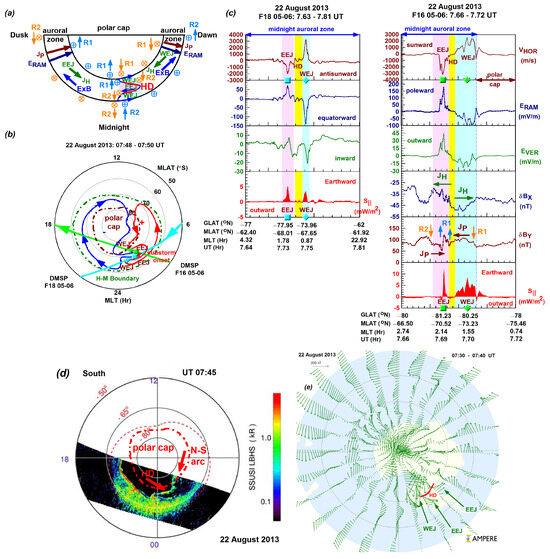 Because of the dawn–dusk alignment of the F15 pass, the line plots in Figure 6c cover the duskside auroral zone and a small section of the polar cap. Again, in the absence of F15 particle data, we specified the duskside auroral zone based on the F18 pass, also depicting the Harang region that we cannot present here because of the poor-quality data; however, we can show these in Figure S9 (see Supplementary Materials). Constructed using the good-quality F15 data, the line plots depict the strong sunward drift (VHOR ≈ 3000 m/s) and underlying poleward E-field (ERAM ≈ 90 mV/m) in the regime of EEJ, where the Hall currents were antisunward-directed, and also the strong antisunward (−) drift (VHOR ≈ −3000 m/s) and underlying equatorward (−) E-field (ERAM ≈ −70 mV/m) in the regime of WEJ, where the Hall currents were sunward-directed. Both the clockwise rotating meridional E-field and the discontinuity itself were observed by DMSP F15. Earthward energy deposition reached ~11.5 mW/m2 within the auroral electrojets and was minimized at ~1 mW/m2 within the discontinuity. These observations provided by F15 are summarized in Table 7.